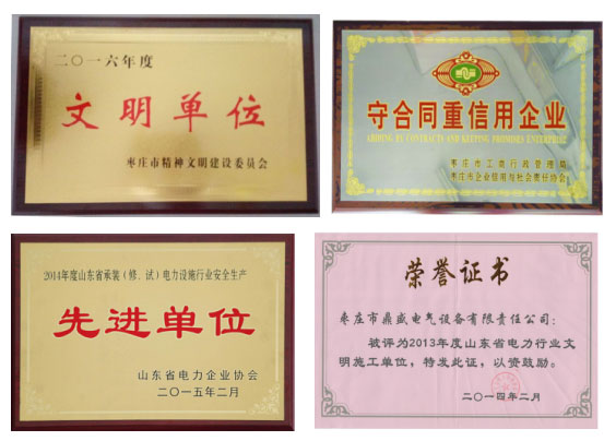 近年來,公司憑借雄厚的技術力量、嚴格的質量管理、良好的服務模式贏得了廣闊的市場和社會好評。多項產品通過國家質量認證中心CCC、CQC認證,并通過了ISO9001質量管理體系、環境管理體系、健康管理體系認證。公司被評為棗莊市市場監管局守合同重信用企業、棗莊市總工會工人先鋒號、棗莊市級精神文明單位、棗莊市百名創業明星企業、山東省電力文明施工企業、山東省電力設施行業安全生產先進單位、AAA信用企業等榮譽稱號。